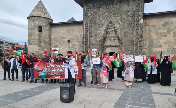 Her hafta Lala Mustafa Paşa Cami avlusunda buluşan hekimler ile sağlık çalışanları, Türk ve Filistin bayrakları eşliğinde taşıdıkları pankartlarla Yakutiye Medresesi’ne kadar yürüdü.
