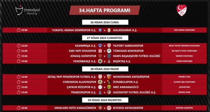 Futbolseverlerin heyecanla beklediği Fenerbahçe-Beşiktaş derbisi, Trendyol Süper Lig 34. haftasında oynanacak. TFF'nin açıkladığı maç programına göre, iki ezeli rakip 27 Nisan Cumartesi günü saat 19. 00'da karşı karşıya gelecek. Ayrıca ligin son 3 haftasında birbirini ilgilendiren maçlar aynı gün ve saatlerde oynatılacak. Trendyol Süper Lig'in 34. ve 35. hafta programları şu şekilde:34. hafta26 Nisan Cuma20. 00 Adana Demirspor - Galatasaray27 Nisan Cumartesi16. 00 Kasımpaşa - Samsunspor16. 00 Sivasspor - Konyaspor19. 00 Hatayspor - RAMS Başakşehir19. 00 Fenerbahçe - Beşiktaş28 Nisan Pazar16. 00 Pendikspor - Kayserispor16. 00 Corendon Alanyaspor - İstanbulspor19. 00 Çaykur Rizespor - MKE Ankaragücü19. 00 Trabzonspor - Gaziantep FK29 Nisan Pazartesi20. 00 Fatih Karagümrük - AntalyasporFenerbahçe-Beşiktaş derbisi ve diğer maçlarla dolu olan Süper Lig heyecanını kaçırmayın!.