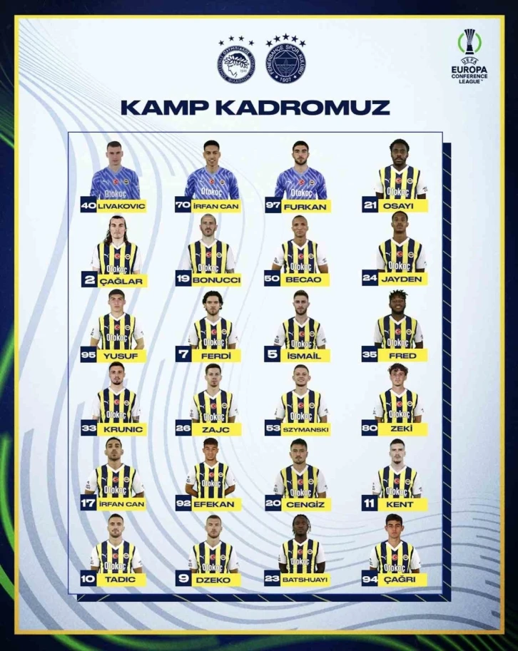 Fenerbahçe’nin, UEFA Avrupa Konferans Ligi Çeyrek Final ilk maçında deplasmanda karşılaşacağı Olympiakos karşılaşmasının kamp kadrosu açıklandı.