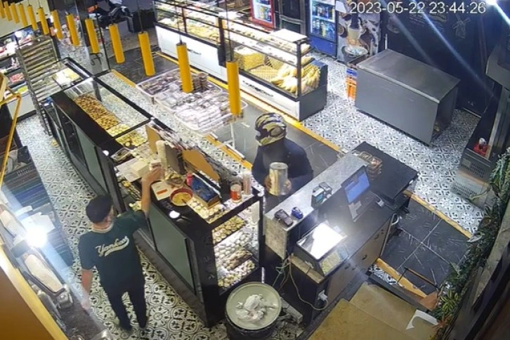 Öte yandan, hırsızlık olayının yaşanmasının ardından çalışanlar tarafından fırının camına, ‘İçeriye kasklı girmek kesinlikle yasaktır' yazısı asıldı. Olay güvenlik kamerası tarafından saniye saniye kaydedildi. Motosikletle fırının önüne gelen kasklı iki şüpheliden biri içeri girip kuru pasta fiyatı soruyor. Daha sonra kutuyu alan şahsın dışarıdaki motosiklete binip uzaklaştığı anlar görülüyor.
