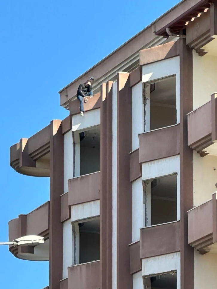 Gaziantep'te Kalyon Kavşağında bir vatandaş ağır hasarlı binanın çatısına çıkarak intihar girişiminde bulunuyor. Polis güvenlik önlemleri alırken itfaiye ve sağlık ekipleri de olay yerinde