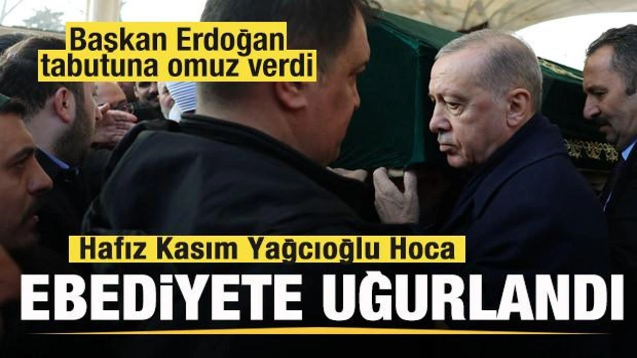 Yağcıoğlu'nun on binlerce talebe yetiştirdiğine dikkati çeken Erdoğan, "On binlerce talebe yetiştiren Kasım hocamız ömrünü bu işe vakfetmiş, gençlerin yetişmesine vakfetmiş ve bir ömür böyle tecelli etmiş. Makamı cennet olsun. Rabbim bizleri inşallah ebedi alemde o muazzam mükellef makamda birlikte haşru cem eylesin." diye konuştu.BAŞKAN ERDOĞAN TABUTUNA OMUZ VERDİ