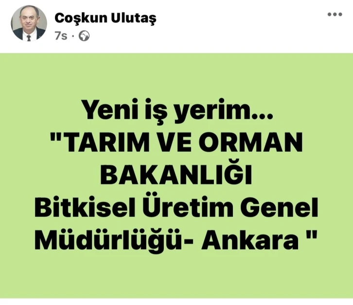 Zonguldak ‘ın Çaycuma ilçesinde uzun yıllardır İlçe Tarım ve Orman Müdürlüğü görevinde bulunan Coşkun Ulutaş’ın tayini çıktı. Çaycuma İlçe Tarım ve Orman Müdürü Coşkun Ulutaş’ın yeni görev yeri belli oldu. 8 yıl sonra tayini çıkan İlçe Müdürü Ulutaş sosyal medya hesabından yeni görev yerini; "Yeni işyerim, Tarım ve Orman Bakanlığı Bitkisel Üretim Genel Müdürlüğü Ankara" olarak paylaştı.