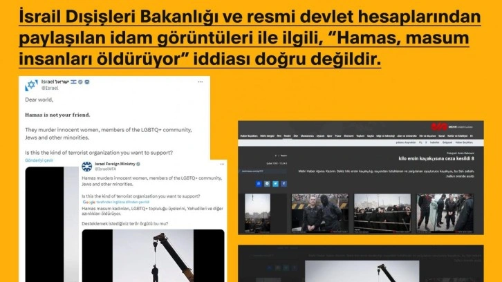 Merkezin sosyal medya hesabından yapılan açıklamada, İsrail Dışişleri Bakanlığı ve İsrail resmi devlet hesaplarından paylaşılan idam görüntüleriyle ilgili, "Hamas, masum insanları öldürüyor" iddiasının doğru olmadığı belirtildi.