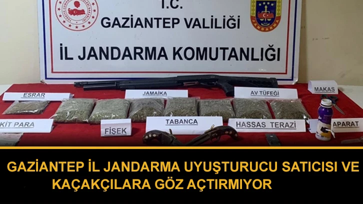 Ekipler operasyon sonucu; 4 kilo 254 gram jamaika, 601 gram metamfetamin, 244 gram kubar esrar, 5 gram kokain, 16 adet uyuşturucu kullanma aparatı, 3 adet tabanca, 1 adet av tüfeği, 31 adet mühimmat, 1 adet kama, 2 adet hassas terazi, 13 bin 465 Türk Lirası ele geçirdi. Olaylarla ilgili 39 şahıs hakkında yasal işlem başlatılırken Gaziantep İl Jandarma Komutanlığı, halkın huzur ve güvenliği için çalışmaların artarak devam edeceğini vurguladı.