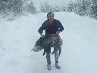 Karlı yolda domuzu elleriyle yakalayan adam konuştu: "Bir anı olsun diye yakaladım, kimseye tavsiye etmem"
