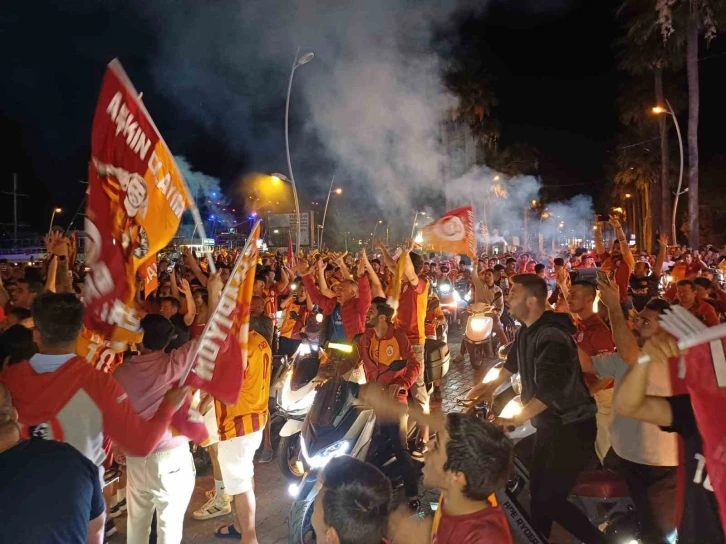 Süper Ligde şampiyon olan Galatasaray taraftarları Muğla’nın Marmaris ilçesinde kutlamalara başladı. Galatasaray’ın Konyaspor’u 3-1 mağlup ederek Süper Lig’de 2023-2024 Şampiyonu olmasının ardından Marmaris’te taraftarlar sokağa döküldü. Ellerinde bayraklarla konvoy yapan Marmaris’te yaşayan Galatasaraylılar meydanda toplandı. Coşkulu kalabalık tezahüratlarla ve yakılan meşalelerle şampiyonluğu kutluyor.