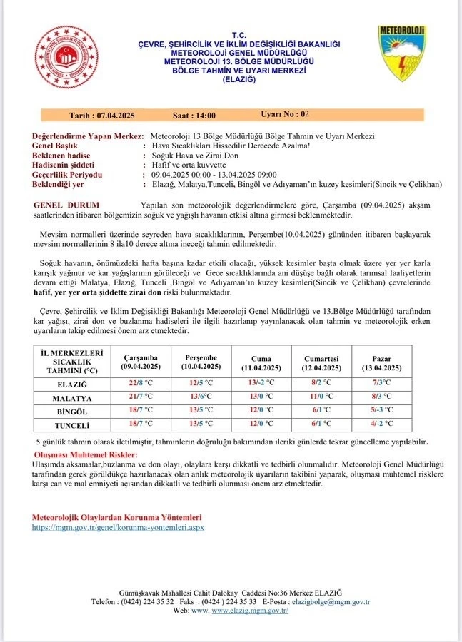 Meteoroloji 13. Bölge Müdürlüğü’nden yapılan açıklamada, "Yapılan son meteorolojik değerlendirmelere göre, Çarşamba (09.04.2025) akşam saatlerinden itibaren bölgemizin soğuk ve yağışlı havanın etkisi altına girmesi beklenmektedir. Mevsim normalleri üzerinde seyreden hava sıcaklıklarının, Perşembe (10.04.2025) gününden itibaren başlayarak mevsim normallerinin 8 ila10 derece altına ineceği tahmin edilmektedir. Soğuk havanın, önümüzdeki hafta başına kadar etkili olacağı, yüksek kesimler başta olmak üzere yer yer karla karışık yağmur ve kar yağışlarının görüleceği ve Gece sıcaklıklarında ani düşüşe bağlı olarak tarımsal faaliyetlerin devam ettiği Malatya, Elazığ, Tunceli, Bingöl ve Adıyaman’ın kuzey kesimleri(Sincik ve Çelikhan) çevrelerinde hafif, yer yer orta şiddette zirai don riski bulunmaktadır. Çevre, Şehircilik ve İklim Değişikliği Bakanlığı Meteoroloji Genel Müdürlüğü ve 13.Bölge Müdürlüğü tarafından kar yağışı, zirai don ve buzlanma hadiseleri ile ilgili hazırlanıp yayınlanacak olan tahmin ve meteorolojik erken uyarıların takip edilmesi önem arz etmektedir. Ulaşımda aksamalar,buzlanma ve don olayı, olaylara karşı dikkatli ve tedbirli olunmalıdır. Meteoroloji Genel Müdürlüğü tarafından gerek görüldükçe hazırlanacak olan anlık meteorolojik uyarıların takibini yaparak, oluşması muhtemel risklere karşı can ve mal emniyeti açısından dikkatli ve tedbirli olunması önem arz etmektedir" denildi.