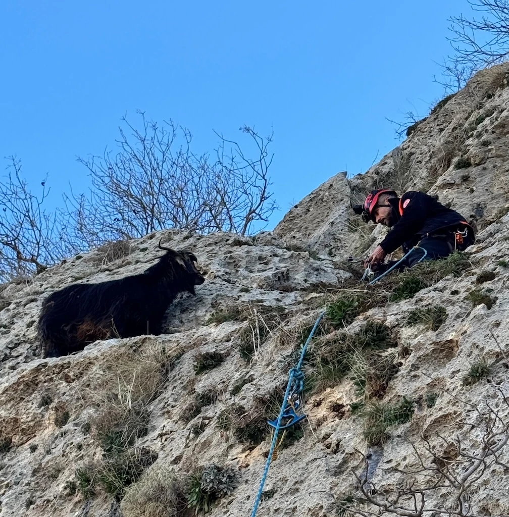 Kayalıklara tırmanan AFAD personeli, sarp ve dik kayalar arasında mahsur kalan keçiye ulaştı. Titizlikle yürütülen çalışmanın ardından keçi bulunduğu noktadan güvenli şekilde kurtarılarak sahibine teslim edildi.