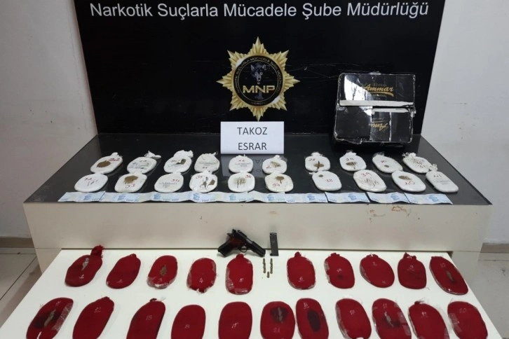 İl Emniyet Müdürlüğünden yapılan açıklamaya göre, Narkotik Suçlarla Mücadele Şube Müdürlüğü ekipleri, il genelinde uyuşturucu madde ticareti yapan şahısların suç unsurları ile birlikte yakalanmasına yönelik yaptıkları çalışmalar çerçevesinde, merkez Akdeniz ilçesinde bulunan bir ikamette narkotik madde arama köpeği 'Miror' ile yapılan aramada, 41 paket halinde 7 kilo 950 gram gelen takoz esrar ele geçirildi.