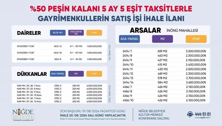 Niğde Belediyesi’nin açık teklif ve açık artırma usulüyle satışa sunduğu gayrimenkullerin ödemeleri yüzde 50’si peşin, kalan yüzde 50’si ise 5 ayda 5 eşit taksitle yapılabilecek.