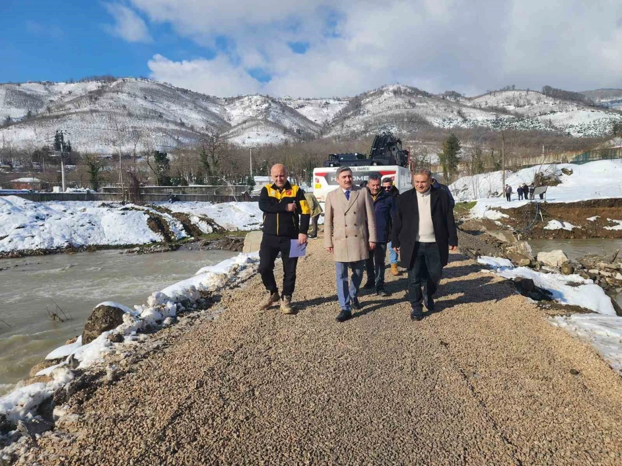 İl Özel İdaresi Genel Sekreteri Nuri Çelik ile Yol ve Ulaşım Hizmetleri Müdürü Savaş Tekin köprü yapım çalışmasını inceleyerek görev yapan ekiplerden çalışmaların son durumu hakkında bilgi aldı. Geçici geçişin güvenli ve kontrollü bir şekilde sağlanabilmesi amacıyla yürütülen çalışmalarda; 9 metre boyunda ve 3 metre çapında boru ile 2,4 metre çapında ve 5 metre boyunda 2 adet boru kullanılarak uygulama gerçekleştiriliyor. Yapılan çalışmalarla birlikte, ulaşımın kesintisiz devam etmesi ve vatandaşların günlük yaşamlarının olumsuz etkilenmemesi hedefleniyor.
