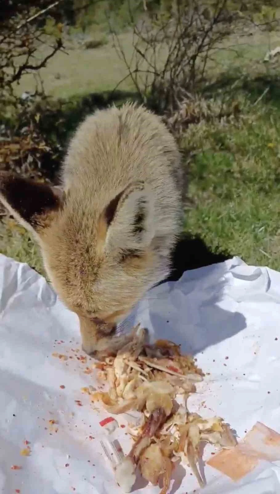 Vatandaşlar o anları ise cep telefonu ile görüntüledi. Renkli anlara sahne olan görüntülerde, tilkilerin yemek yedikten bir süre sonra ağzına aldığı kemik parçalarıyla uzaklaştığı görülüyor.