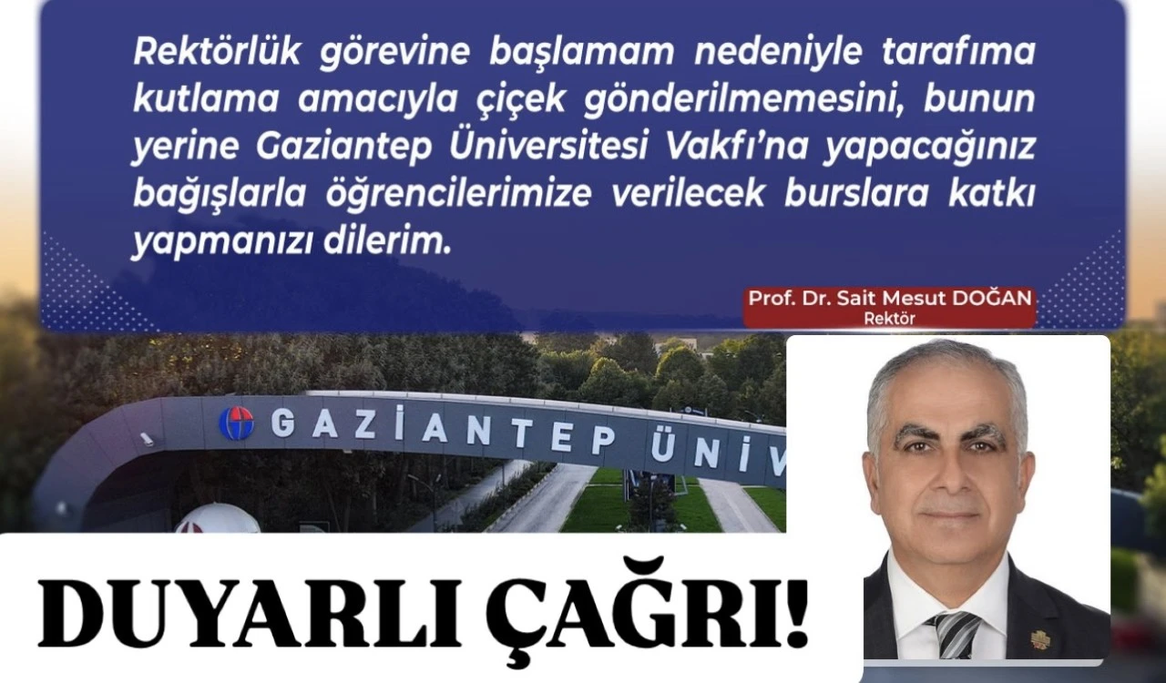 “Rektörlük görevine başlamam nedeniyle tarafıma kutlama amacıyla çiçek gönderilmemesini, bunun yerine Gaziantep Üniversitesi Vakfı’na yapacağınız bağışlarla öğrencilerimize verilecek burslara katkı yapmanızı dilerim.”