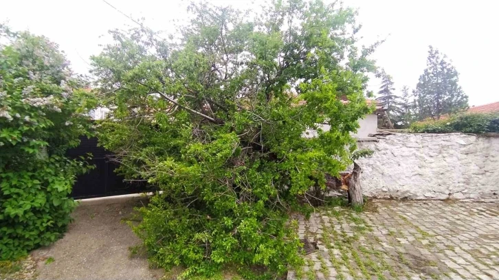 Konya’nın Yunak ilçesinde şiddetli rüzgarın etkisiyle büyük bir erik ağacı gövdesinden kırılarak devrildi.