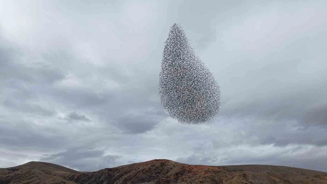 Kırıkkale’de sığırcık kuşlarının sürüler halinde gökyüzünde oluşturduğu şekiller ve ani dönüşlerle sergilediği hareketlilik, görsel şölen oluşturdu.