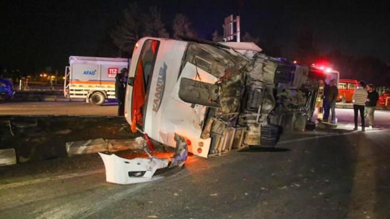 Çarpmanın etkisiyle işçi servisi yola devrildi.