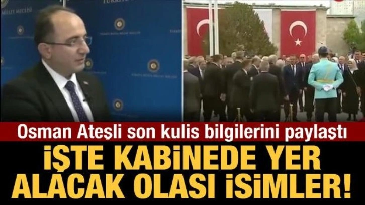 Sadece 2 bakanın görevlerine devam edeceğini belirten Ateşli, “Fahrettin Koca ile Mehmet Nuri Ersoy’un görevlerine devam edeceği biliniyor. Kendileri zaten milletvekili adayı olmamışlardı. Sanayi ve Teknoloji Bakanlığı için Fatih Kacır’ın ismi geçiyor. Bakan yardımcılığı görevini yürütüyordu. Genlik ve Spor Bakanlığı için Osman Aşkın Bak’ın adı geçiyor. Sürpriz isimlerden bir tanesi olarak konuşuluyor. Cumhurbaşkanlığı Sözcülüğü’ne Akif Çağatay Kılıç ismi konuşuluyor. Kulislerden edindiğimiz bilgilerde Mustafa Şentop’un Cumhurbaşkanı Yardımcılığı’na getirileceği söyleniyordu. Bunun yanında Sayın Fuat Oktay’ın devam edeceği yönünde bu sabahtan itibaren bir kulis bilgisine ulaştık. Bütün bu soru işaretlerinin cevabı aslında bu akşam saat 22.00’da Sayın Cumhurbaşkanı’nın açıklamasıyla nihayete ermiş olacak.” diye konuştu.
