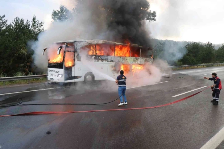 Olay, saat 06.30 sıralarında TEM Otoyolu Çaydurt mevkiinde meydana geldi. Edinilen bilgiye göre, Trabzon’dan İstanbul’a seyir halinde olan Barış Baca idaresindeki 06 BAZ 818 plakalı 45 yolcusu bulunan Ali Osman Ulusoy firmasına ait otobüsün motor bölümünde henüz bilinmeyen bir sebeple yangın çıktı. Otobüste duman çıktığını gören sürücü aracı emniyet şeridine çekerek yolculardan otobüsü terk etmelerini istedi.