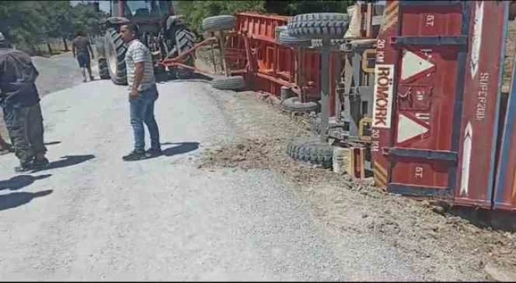 Konya’nın Kulu ilçesinde yol yapımı nedeniyle daralan yolda traktöre bağlı 2 römorkun devrilmesi sonucu, yaklaşık 20 ton mercimek yola saçıldı.