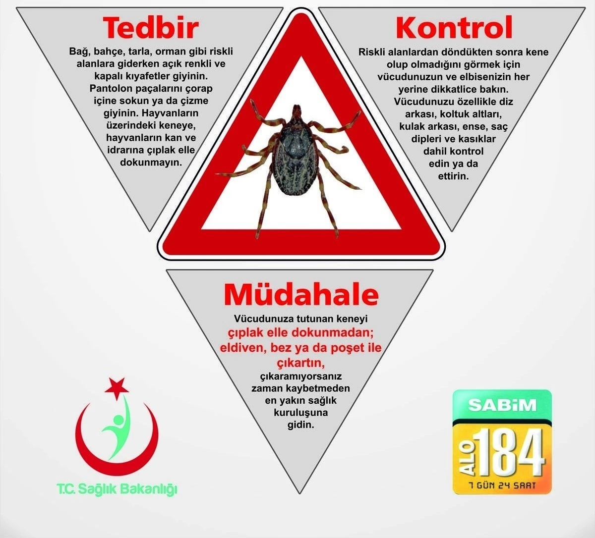 "Kene ısırmasının tespit edilmesinde özellikle anne babaların küçük çocuklarının vücutlarını kene ısırığı konusunda detaylı olarak incelemeleri önemlidir. Hızlı bir seyir izleyen viral ve hemorajik (kana yayılan) bir hastalık olan KKKA’nın erken teşhis edilmesi çok önemlidir. Ayrıca açık renkli kıyafetler kene tespitini kolaylaştırdığından tercih edilmelidir. Eve gelindiğinde vücut kene yönünden kontrol edilmeli, kene varsa en yakın sağlık kuruluşuna gidilmeli ve zararlı bir cımbızla deriye yapıştığı yerden tutulup sağa sola oynatılarak çivi çıkarır gibi çıkarılmalıdır. Kenenin uzaklaştırılmasından sonra ellerin su ve sabunla yıkanması, kenenin ısırdığı bölgenin ise iyot çözeltisi gibi bir antiseptikle, alkolle veya deterjanlı su ile temizlenmesi gerekmektedir. Keneler çıkartılırken öldürülmemeli ve patlatılmamalıdır. Keneleri vücuttan uzaklaştırmak amacıyla, üzerlerine sigara basmak veya kolonya ve gaz yağı dökmek gibi yöntemlere başvurulmamalıdır. Görev nedeni ile risk grubunda yer alan kişilerin hayvan ve hasta insanların kan ve vücut sıvılarından korunmak için mutlaka eldiven, önlük, gözlük, maske gibi giymeleri gerekmektedir. Kızarıklık ve yüksek ateş gibi KKKA hastalığının belirtilerinin görülmesi halinde hemen en yakın sağlık kuruluşuna başvurulmalıdır."