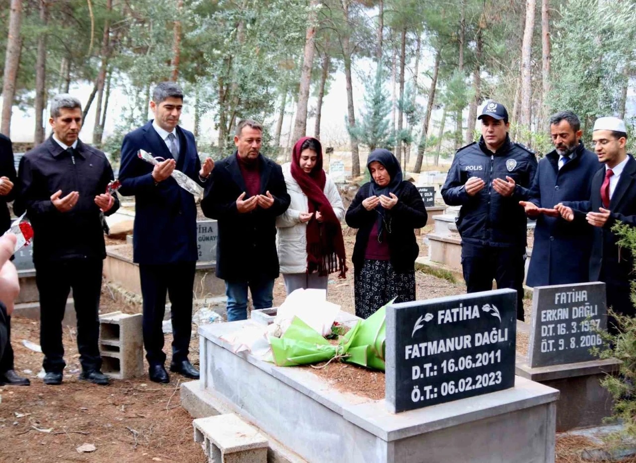 Gaziantep’in Yavuzeli ilçesinde asrın felaketi depremlerde hayatını kaybeden Fatmanur Dağlı, ilçe protokolü ve ailesi tarafından mezarı başında dualarla anıldı.