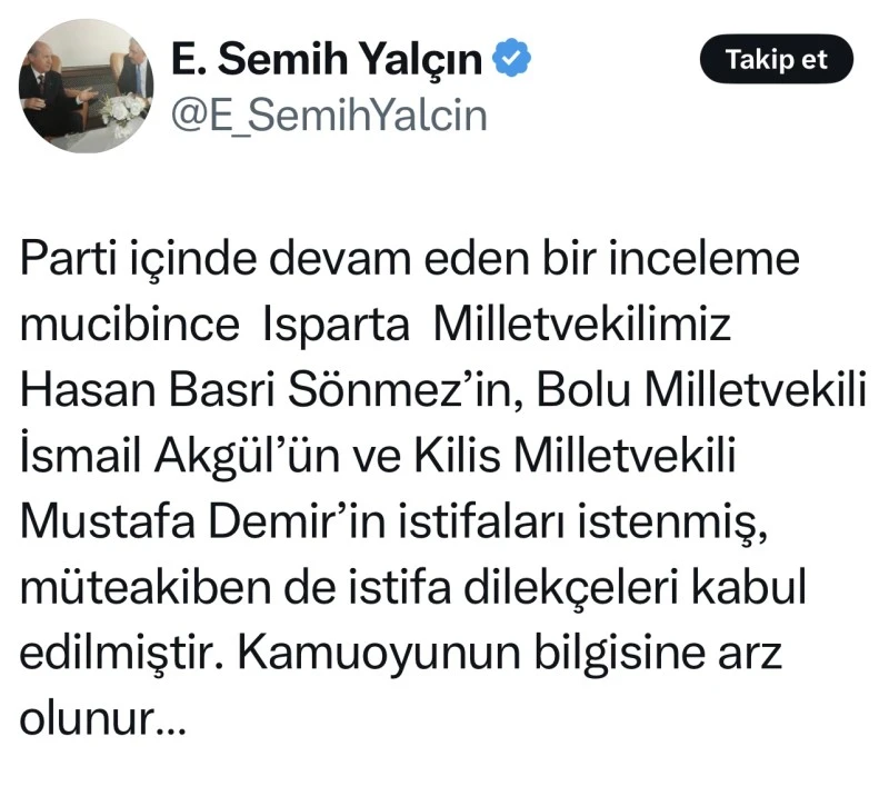 Milliyetçi Hareket Partisi (MHP) Genel Başkan Yardımcısı Semih Yalçın, 3 milletvekilinin istifasının istendiğini sosyal medya hesabından duyurdu.