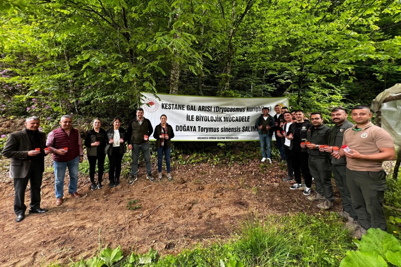 Bu kapsamda Bolu Orman Bölge Müdürlüğü laboratuvarında üretilen 4 bin adet Torymus Sinensis’in Orman Zararlılarıyla Mücadele Şube Müdürlüğü ve Akçakoca Orman İşletme Müdürlüğü personellerinin katılımıyla Altınçay ve Cumayanı Orman İşletme Şefliklerine ait kestane ormanlarına salımı yapılmıştır.