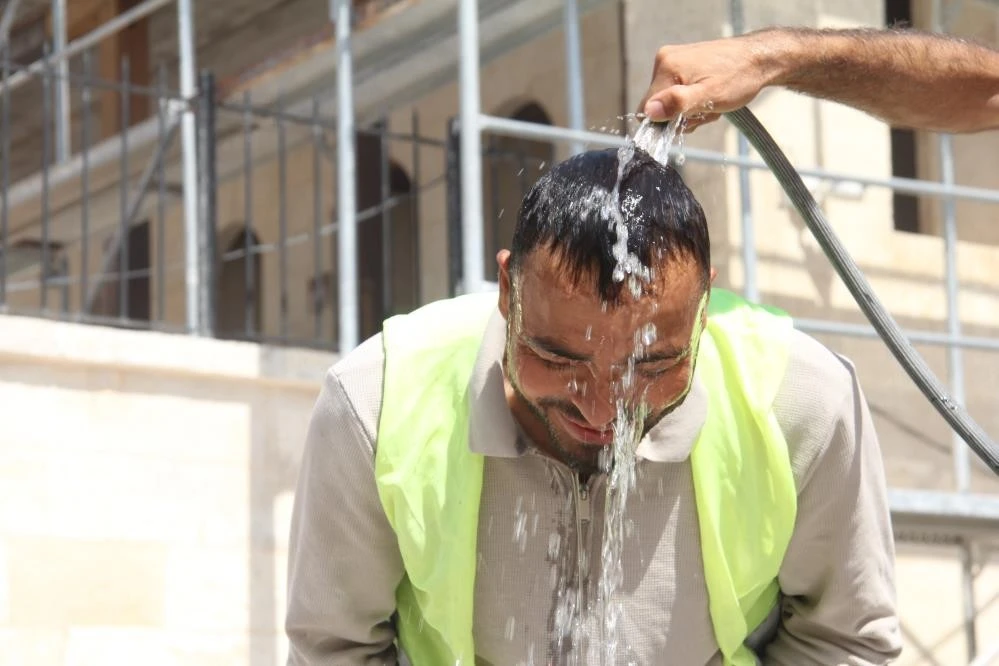 Kavurucu sıcakta mesailerini sürdüren işçiler su içerek, ellerini ve yüzlerini yıkayarak serinlemeye çalışıyor.
