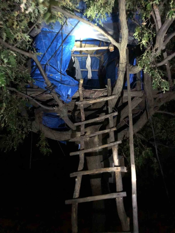Manisa’nın Sarıgöl ilçesinde hakkında kesinleşmiş 5 yıl hapis cezası bulunan şahıs, ormanlık alanda meşe ağacının üzerine yaptığı çadır içinde uyurken yakalandı.