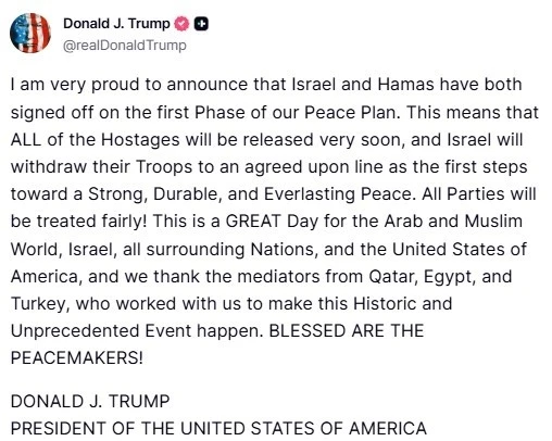 ABD Başkanı Donald Trump, Gazze Şeridi’nde kalıcı barış sağlanmasını öngören Gazze Planı’nın ilk aşamasının "İsrail ve Hamas tarafından onaylandığını" duyurarak, "Bu tarihi ve eşi benzeri görülmemiş olayın gerçekleşmesi için bizimle birlikte çalışan Katar, Mısır ve Türkiye’den arabuluculara teşekkür ederiz" açıklamasında bulundu.