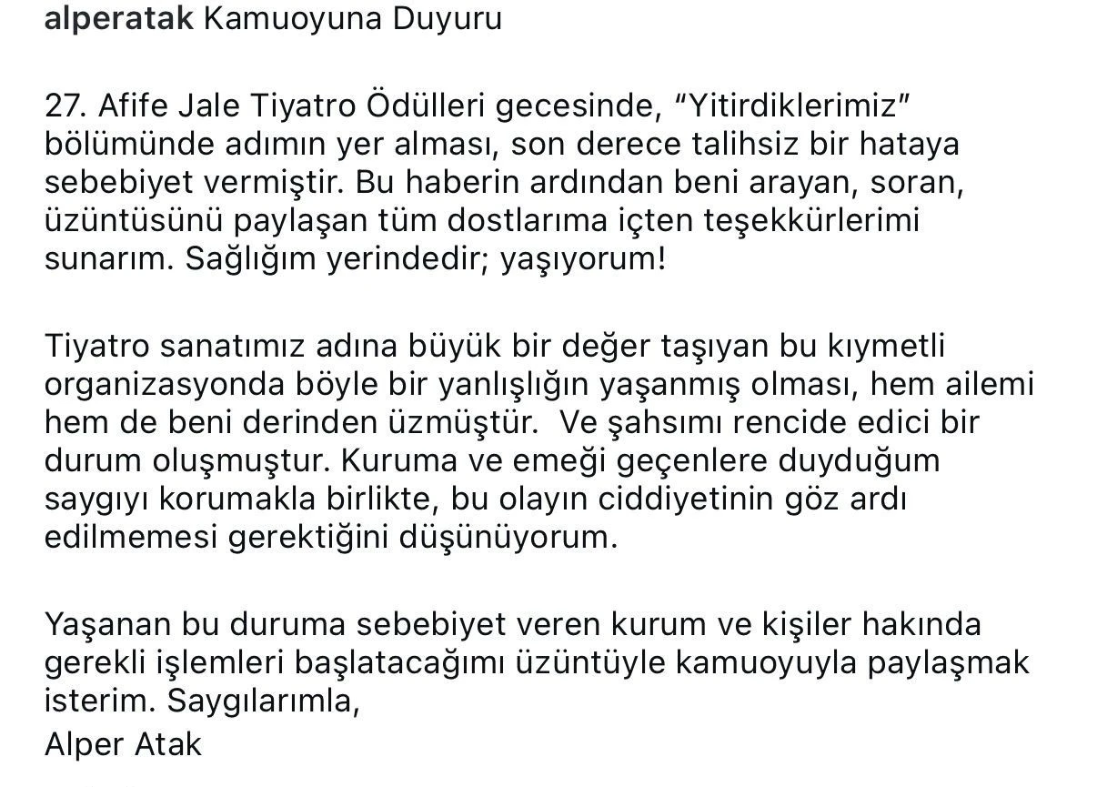 Yaptığı paylaşımda söz konusu yanlışlık nedeniyle şikayetçi olacağını duyuran Atak, "27. Afife Jale Tiyatro Ödülleri gecesinde, ‘Yitirdiklerimiz’ bölümünde adımın yer alması, son derece talihsiz bir hataya sebebiyet vermiştir. Bu haberin ardından beni arayan, soran, üzüntüsünü paylaşan tüm dostlarıma içten teşekkürlerimi sunarım. Sağlığım yerindedir, yaşıyorum. Tiyatro sanatımız adına büyük bir değer taşıyan bu kıymetli organizasyonda böyle bir yanlışlığın yaşanmış olması, hem ailemi hem de beni derinden üzmüştür. Ve şahsımı rencide edici bir durum oluşmuştur. Kuruma ve emeği geçenlere duyduğum saygıyı korumakla birlikte, bu olayın ciddiyetinin göz ardı edilmemesi gerektiğini düşünüyorum. Yaşanan bu duruma sebebiyet veren kurum ve kişiler hakkında gerekli işlemleri başlatacağımı üzüntüyle kamuoyuyla paylaşmak isterim. Saygılarımla, Alper Atak" ifadelerine yer verdi.