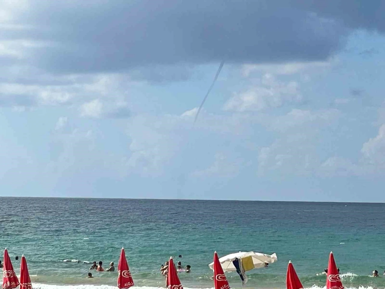 Alanya’da rüzgarlı hava etkili olurken, İncekum Plajı’nda denize dikey şekilde uzanan bir hortum çıktı. Plajda denize giren tatilcilerin merakla izlediği hortum bir süre sonra gözlerden kayboldu. Sahildekiler hortum anında ve sonrasında da denize girmeyi sürdürdü.
