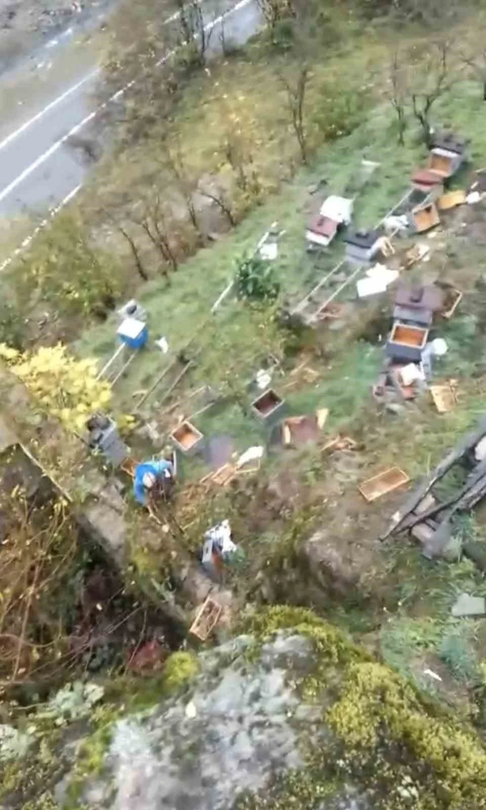 Trabzon’un Araklı ilçesine bağlı Taşgeçit Mahallesi’nde arıcılık yapan Ziya Kotaman’a ait arı kovanlarına gece saatlerinde ayı saldırdı. Sabah saatlerinde kovanlarının tamamının parçalanmış olduğunu gören Kotaman, büyük şok yaşadı.