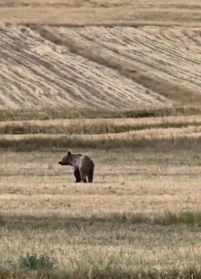 Tarlalarda yiyecek arayan boz ayı insanları fark edince kaçarak uzaklaştı.