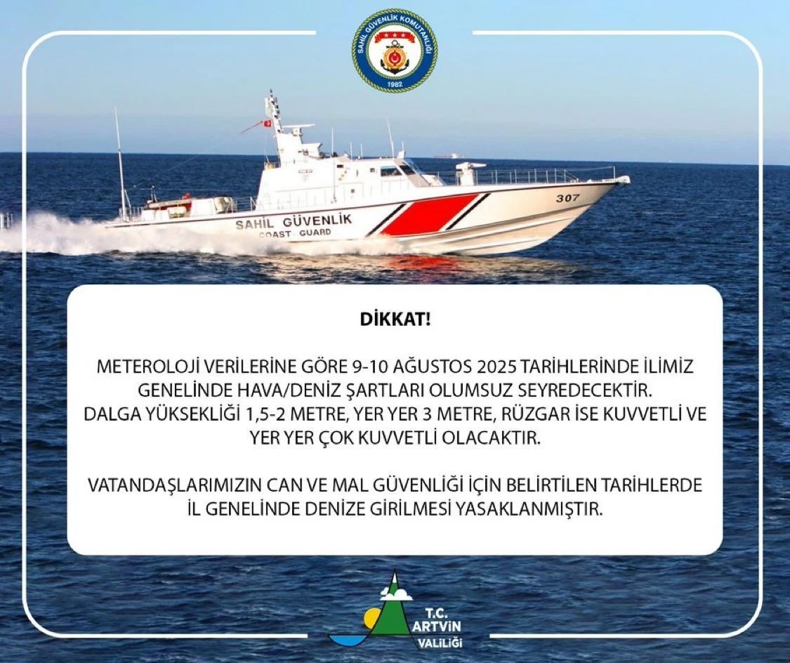 Artvin Valiliği, 9-10 Ağustos 2025 tarihlerinde il genelinde beklenen olumsuz hava ve deniz şartları nedeniyle vatandaşların denize girmesini yasakladı.