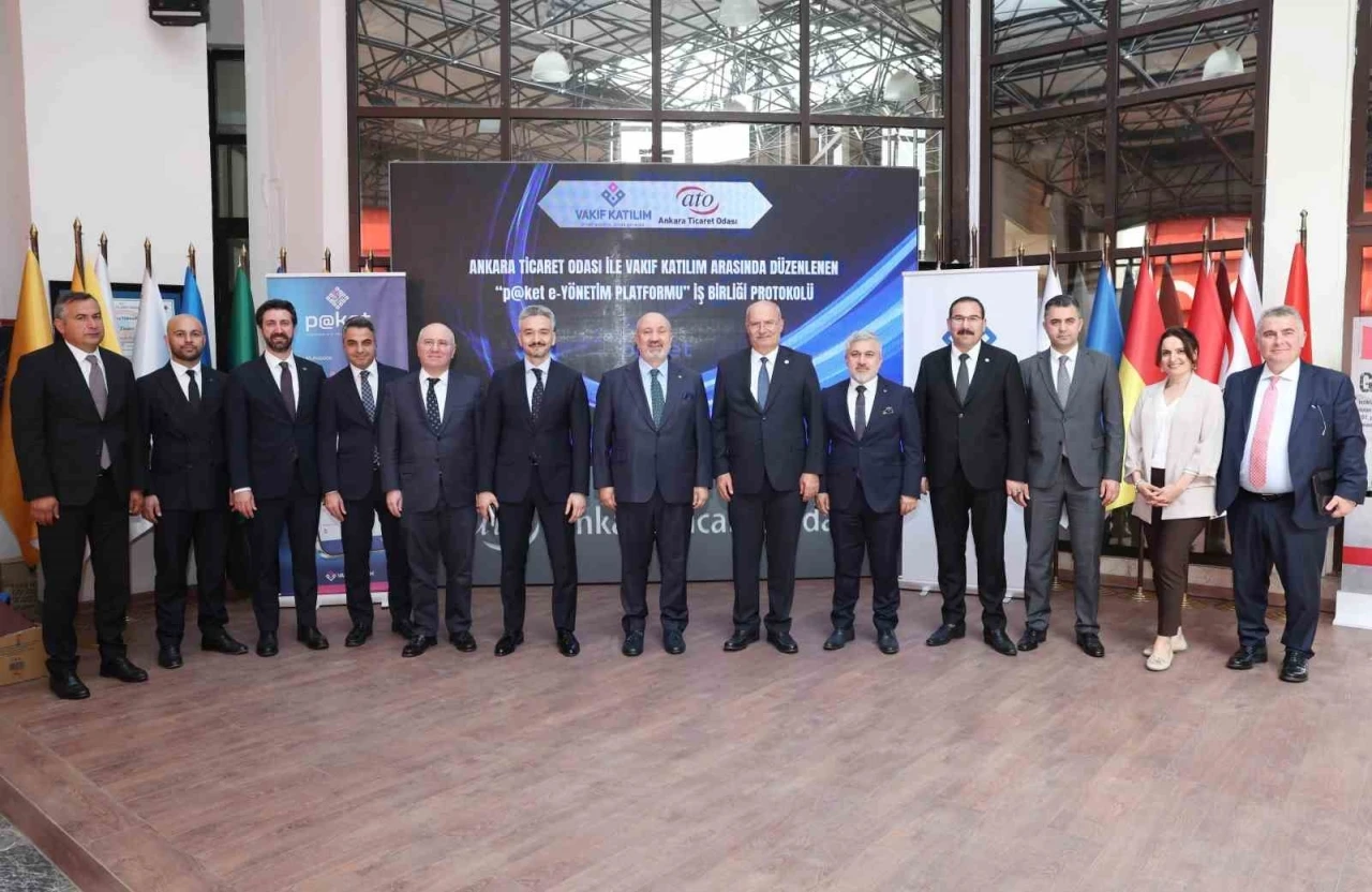 Ankara Ticaret Odası (ATO) üyelerinin, bankadaki işlemlerini ön muhasebe uygulamasıyla birleştirerek tek bir platform üzerinden yapmalarına imkân sağlayacak "p@ket e-Yönetim Platformu" işbirliği protokolü ATO Başkanı Gürsel Baran ile Vakıf Katılım Genel Müdürü Mehmet Ali Akben tarafından imzalandı.