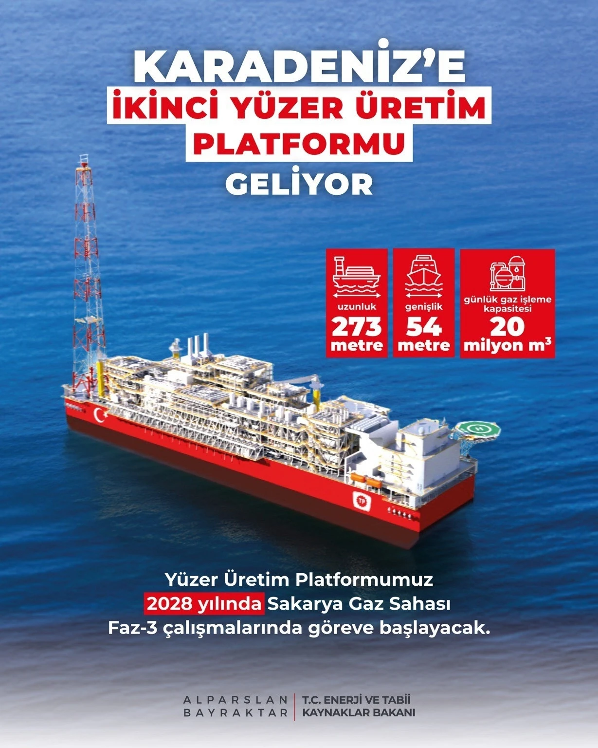 Şu anda Karadeniz’deki Sakarya Gaz Sahası’ndan günlük 9,5 milyon metreküp gaz üretildiğini ve 2026’nın ortasında görev yapmaya başlayacak olan Osman Gazi Yüzer Üretim Platformu ile üretimin günlük 20 milyon metreküpe ulaşacağını hatırlatan Bakan Bayraktar, "Osman Gazi Yüzer Üretim Platformumuza bir kardeş gelecek. İnşası Çin’de devam eden yeni platformumuzun 2027 sonunda Türkiye’ye doğru yola çıkmasını bekliyoruz. 2028 yılı ortasında devreye almayı planladığımız yeni üretim platformu, Karadeniz’de görev yapacak ve buradaki üretimimizde gücümüze güç katacak. Bizi faz-3 aşamasına taşıyacak olan yeni platformumuz ile Sakarya Gaz Sahası’ndaki üretimimiz, bugüne kıyasla 4 katına çıkarak günlük 40 milyon metreküpe yükselecek" dedi.
