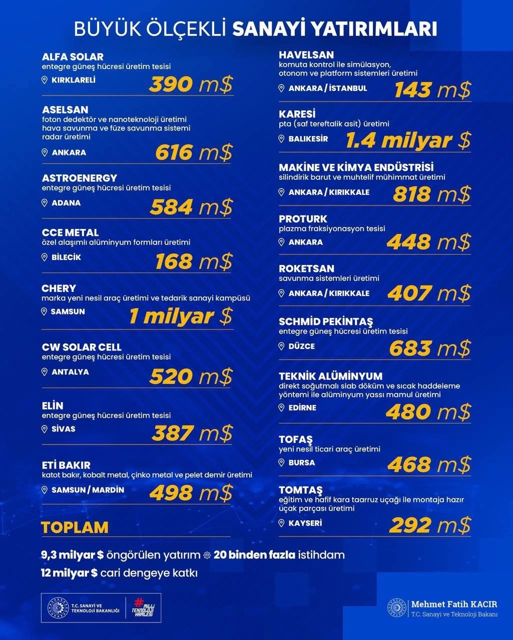 Sanayi ve Teknoloji Bakanı Mehmet Fatih Kacır, yıllık cari dengeye 12 milyar dolarlık katkı sağlayacak olan büyük ölçekli sanayi yatırımlarını paylaştı. Sanayi ve Teknoloji Bakanı Mehmet Fatih Kacır, 9,3 milyar dolarlık öngörülen yatırım tutarı ile 20 binden fazla istihdam ve yıllık cari dengeye 12 milyar dolarlık katkı sağlayacak olan Büyük Ölçekli Sanayi yatırımlarının ayrıntılarını paylaştı. Geçtiğimiz günlerde Cumhurbaşkanı Recep Tayyip Erdoğan tarafından açıklanan yatırımların ayrıntılarını sosyal medya hesabından paylaşan Bakan Kacır, şu ifadeleri kullandı: "Edirne’den Samsun’a, Bilecik’ten Sivas’a 15 şehrimizde hayata geçecek büyük ölçekli sanayi yatırımları Türkiye’ye güç katacak. Güneş enerjisi teknolojilerinden yeni nesil araçlara, savunma sanayiinden sağlık teknolojilerine, ana metalden petrokimyaya Türkiye, yenilikçi teknolojilerde ve hammadde arz güvenliğinde yükselişini sürdürecek. 9,3 milyar dolar yatırımla, 20 binden fazla istihdam sağlanacak, cari dengemize yıllık 12 milyar dolar katkı sunulacak" İfadelerini kullandı. Bakan Kacır’ın paylaşımında Chery markasının Samsun’da gerçekleştireceği 1 milyar dolarlık Yeni Nesil Araç Üretimi ve Tedarik Sanayi Kampüsü de yer aldı. Kacır’ın alfabetik olarak paylaştığı listede yer alan firmalar, yatırım konuları ve tutarları ise şu şekilde: Alfa Solar Enerji: 390 milyon dolar - Kırklareli