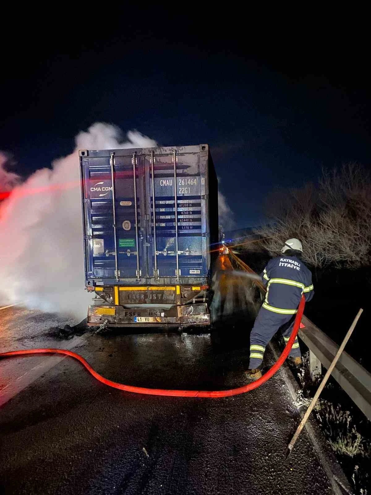 Yangın Anadolu Otoyolu Düzce geçişinde meydana geldi. Alınan bilgilere göre, Bolu’dan Düzce istikametine seyir halinde olan sürücüsünün ismi alınamayan 41 plakalı tırın balatalarından lastikleri tutuştu. Sürücü bunu fark edince hemen aracı emniyet şeridine çekip tırın kupasını dorseden ayırarak itfaiye ekiplerine bildirdi. İhbar üzerine kısa süre içerisinde bölgeye gelen Kaynaşlı Belediyesi İtfaiye Müdürlüğü ekipleri balatalarda çıkan yangını büyümeden söndürerek kontrol altına aldı. Yangın sebebiyle kontrollü verilen yol söndürme çalışmalarının tamamlanmasının ardından normal seyrine döndü.
