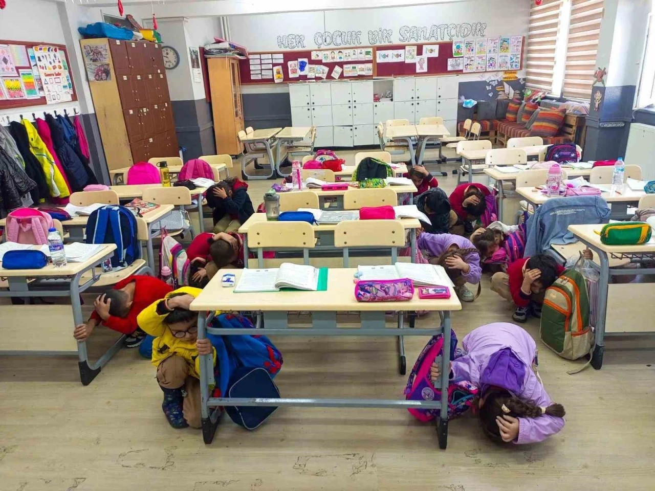 Tatbikat kapsamında öğrenciler, "Çök-Kapan-Tutun" uygulamasıyla bir deprem anında doğru davranış biçimlerini pekiştirirken, öğretmenlerin rehberliğinde güvenli şekilde okul binalarını tahliye etti.