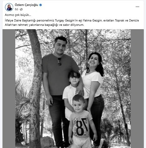 Aydın’ın Nazilli ilçesinde çıkan yangında bir itfaiye erinin eşi ve iki çocuğunun hayatını kaybetmesinin ardından Aydın Büyükşehir Belediye Başkanı Özlem Çerçioğlu yayımladığı başsağlığı mesajında "Acımız çok büyük" ifadesine yer verdi. Aydın’ın Nazilli ilçesinde sabah erken saatlerde çıkan yangında itfaiye eri Turgay Gezgin’in eşi ve iki çocuğu hayatını kaybetti. Olayın duyulmasının ardından Aydın Büyükşehir Belediye Başkanı Özlem Çerçioğlu sosyal medya hesaplarından yaptığı başsağlığı paylaşımında üzüntüsünü dile getirerek, "Acımız çok büyük. İtfaiye Daire Başkanlığı personelimiz Turgay Gezgin’in eşi Fatma Gezgin, evlatları Toprak ve Deniz’e Allah’tan rahmet; yakınlarına başsağlığı ve sabır diliyorum" dedi.