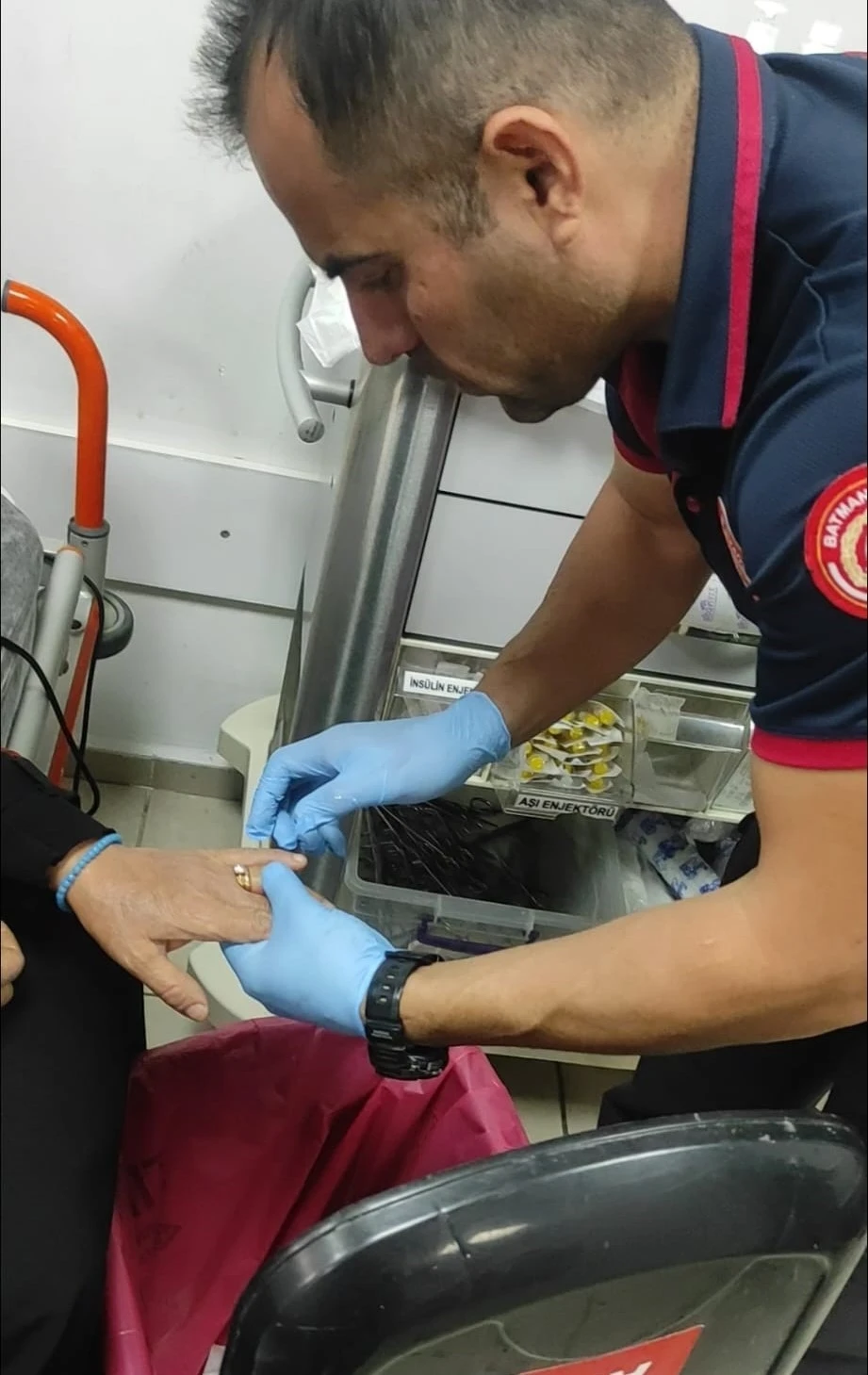 Batman’da bir kadının parmağına sıkışan yüzük itfaiye ve sağlık ekiplerinin ortak operasyonuyla çıkarıldı.