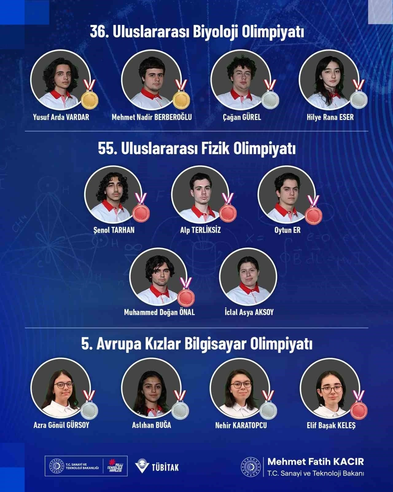 Bakan Kacır, "Öğrencilerimiz bilim olimpiyatlarında bayrağımızı gururla dalgalandırmaya devam ediyor. Filipinler’de düzenlenen, 78 ülkeden 296 öğrencinin yarıştığı 36’ncı Uluslararası Biyoloji Olimpiyatı’nda 2 altın, 2 gümüş madalya, Fransa’da düzenlenen, 94 ülkeden 415 öğrencinin yarıştığı 55’inci Uluslararası Fizik Olimpiyatı’nda 4 bronz madalya 1 mansiyon ödülü, Almanya’da düzenlenen, 60 ülkeden 227 öğrencinin yarıştığı 5’inci Avrupa Kızlar Bilgisayar Olimpiyatı’nda 3 gümüş, 1 bronz madalya kazanan öğrencilerimizi yürekten kutluyorum. Gençlerimizin kararlılığı ve azmi bizim en büyük gücümüz. Onların her daim yanındayız" dedi.