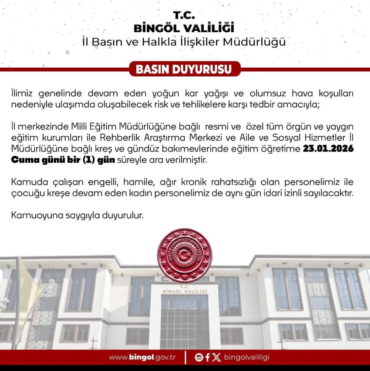 Bingöl Valiliği tarafından yapılan açıklamada, "İlimiz genelinde devam eden yoğun kar yağışı ve olumsuz hava şartları nedeniyle ulaşımda yaşanabilecek risk ve tehlikelere karşı tedbir amacıyla; il merkezinde Milli Eğitim Müdürlüğüne bağlı resmi ve özel tüm örgün ve yaygın eğitim kurumları ile Rehberlik Araştırma Merkezi ve Aile ve Sosyal Hizmetler İl Müdürlüğüne bağlı kreş ve gündüz bakımevlerinde, 23 Ocak 2026 Cuma günü eğitim ve öğretime 1 gün süreyle ara verilmiştir. Kamuda çalışan engelli, hamile, ağır kronik rahatsızlığı bulunan personel ile çocuğu kreşe devam eden kadın personelin de aynı gün idari izinli sayılacaktır" denildi.