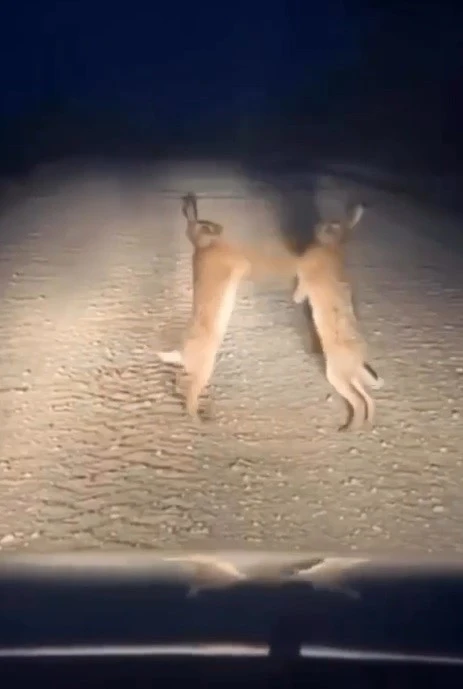 Bayburt’un Aydıntepe ilçesinde iki yaban tavşanı yol ortasında kavga ederken görüntülendi. Boks maçını aratmayan o anlar, yoldan geçen bir sürücü tarafından cep telefonu kamerasıyla kaydedildi.