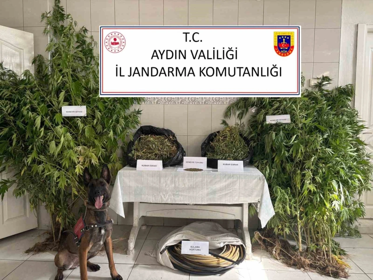 Aydın’ın Bozdoğan ilçesinde ormanlık alan içerisinde kenevir yetiştirdiği tespit edilen şahıs yakalanırken, yapılan aramalarda 5340 gram uyuşturucu madde ele geçirildi. Bozdoğan İlçe Jandarma Komutanlığınca "Uyuşturucu Madde İmal ve Ticaretine" yönelik çalışmada; Altıntaş Mahallesinde ikamet eden Y.K. isimli şüpheli şahsın farklı tarihlerde ormanlık alan içerisinde uyuşturucu madde elde etmek amacıyla yetiştirdiği kenevir bitkisini kontrol etmeye geldiğinin tespit edilmesi üzerine kenevir ekimi yaptığı ormanlık alanda ve tespiti yapılan 4 ikamet ve eklentilerinde uyuşturucu madde köpeği ile arama yapıldı. Yapılan aramalarda 5 bin 340 gram kubar esrar ( 5 kilogram 340 Gram), 58 Kök kenevir bitkisi, 1278 adet kenevir tohulu, 200 metre sulama hortumu ele geçirildi. Yakalanan şüpheli Y.K. tutuklanarak cezaevine gönderildi.