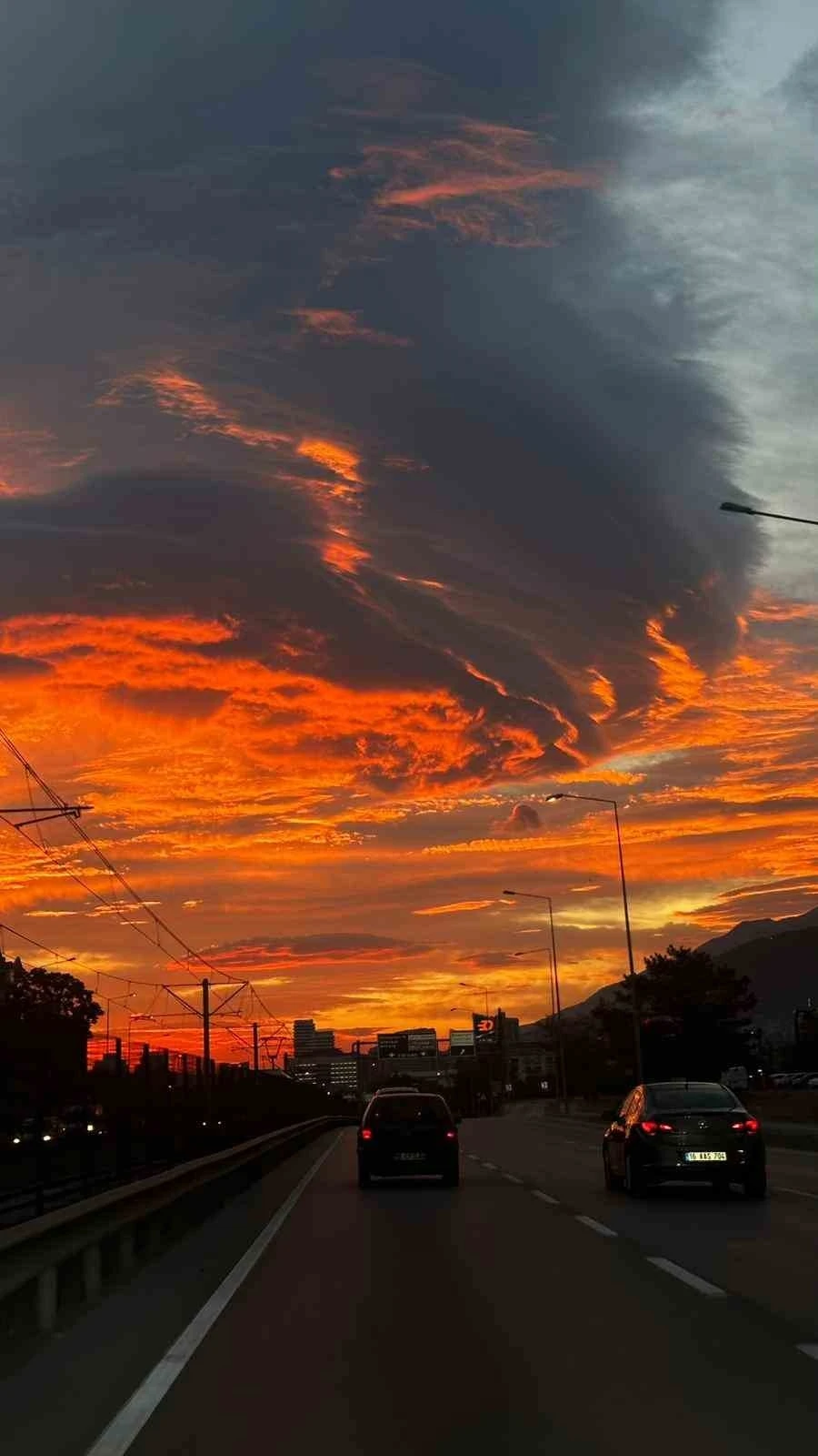 Bursa’da sabah saatlerinde gökyüzünde beliren sıra dışı bulut oluşumu şehrin farklı noktalarından görüntülendi. Gün doğumuyla birlikte turuncu ve kırmızı tonlarına bürünen gökyüzü, adeta kartpostallık manzaralar ortaya çıkardı.
