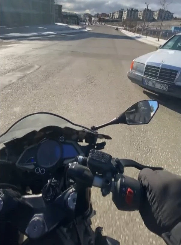 Eskişehir’de ara sokaktan caddeye aniden çıkan araca çarpmaktan yaptığı hamle ile kıl payı kurtulan motosiklet sürücünün yaşadıkları kask kamerasına yansıdı. Motosiklet sürücüsü, araç sürücüsüne, "Yaşına hürmetim var, ama kurtarmasam ne olacaktı biliyorsun değil mi? Sana hiçbir şey olmayacaktı, 2 tane sabinin canını alacaktın" dedi.