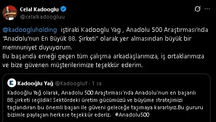 “Kadooğlu Holding bünyesindeki Kadooğlu Yağ’ın Anadolu 500’de 88. sıraya yükselmesi hepimiz için büyük bir gurur kaynağı. Bu başarı; ekiplerimizin özverili çalışmasının, iş ortaklarımızın desteğinin ve müşterilerimizin bize duyduğu güvenin bir sonucudur. Emeği geçen herkese teşekkür ederim.”